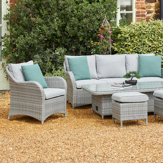 The Monte Carlo Stone collection features on trend grey coloured EverWeave dining and lounge sets designed in a traditional roundback seating style. Multi-tonal grey EverWeave paired with slate grey cushions.