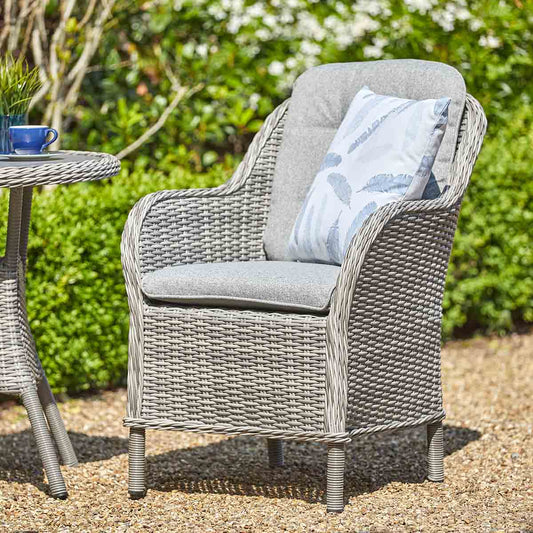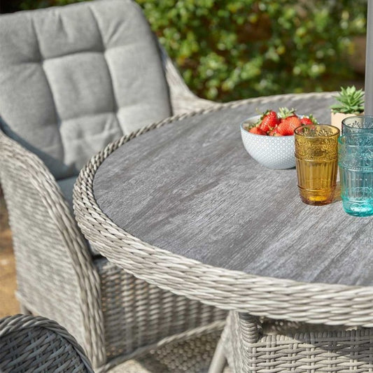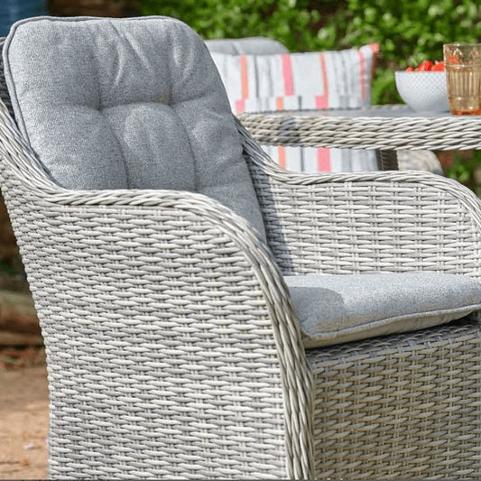 The St Tropez Stone collection uses durable all-weather materials for a natural weave and wood-effect range. The wood effect ceramic glass tabletops give a classically natural look and feel with rod detailing and luxurious cushions. Tonal pebble grey weave paired with textured grey cushions and grey wood effect table tops.
