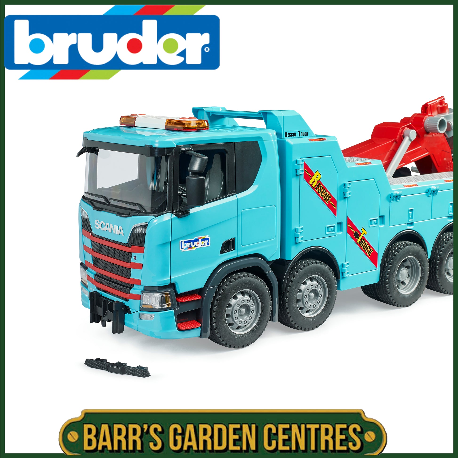 Recovery and towing trucks for commercial vehicles and trucks are among the most spectacular vehicles that children can discover on our roads. And the superior power and technology of these vehicles is impressive. At BRUDER, children can now discover and recreate these fascinating features on the new Scania Super 560R Recovery and Towing Truck. The wheel lift can be folded down and accommodates the front wheels of the vehicle to be towed. Behind one of the many opening flaps, the main arm height adjustment is situated, with which the main arm including the vehicle can be raised. A cable winch is located at the tip of the telescopic main arm. The supplied adapter can be attached to the bumper of a MAN TGS, MB Arocs, MACK, SCANIA to be recovered, and a vehicle that has been involved in an accident be recovered and towed to the wheel lift with the cable winch.