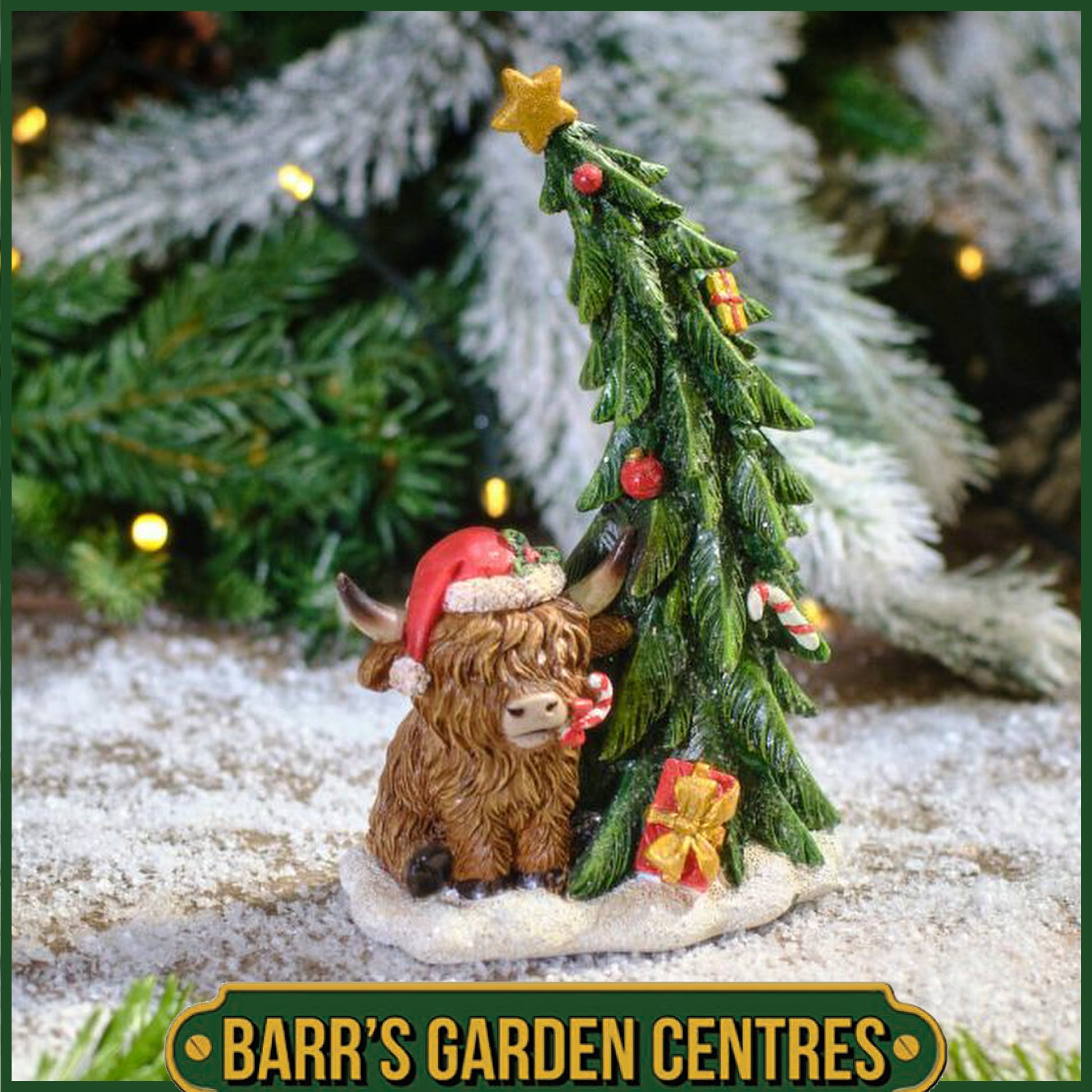Bring festive countryside charm to your decor with the Christmas Resin Highland Cow with Tree Ornament. This detailed resin ornament features a brown Highland cow wearing a red Santa hat, sitting beside a green Christmas tree adorned with ornaments, a yellow star, and presents, all resting on a snow-like white base. Perfect for tabletops, mantels, or as part of a collectible holiday display, it adds a whimsical and cheerful touch to your seasonal decor.