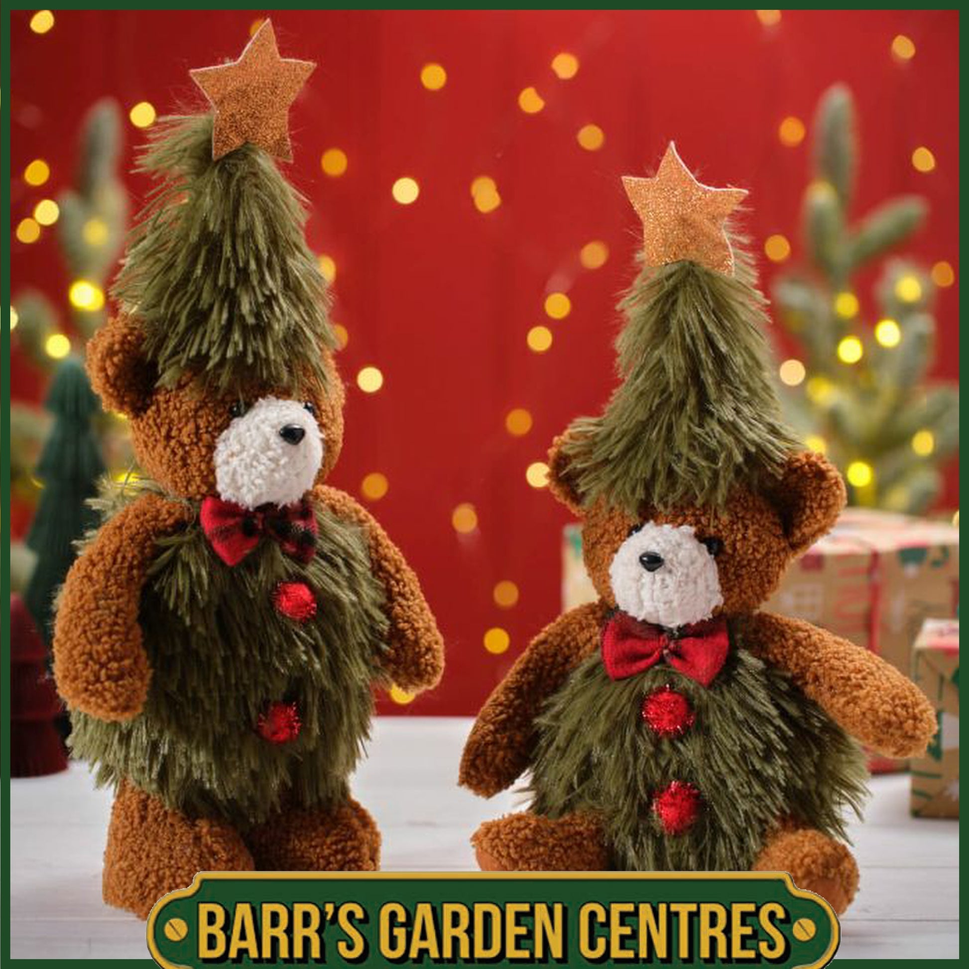 Bring a playful touch to your festive decor with this plush brown bear dressed in a green Christmas tree costume. Complete with red ornaments, a bright red bow, and a glittery gold star on top, this charming figure adds warmth and whimsy to holiday displays. Perfect for tabletops, mantels, or as a delightful gift, it’s a fun way to spread Christmas cheer.