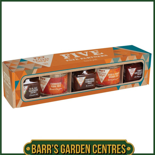 Pâté for every party, the Five Pâté Partners selection from Cottage Delight has a duo of quality pates, some complimenting chutneys, and a farmhouse pickle. Ideal for a cheese lover, this Five-piece set is ideal for completing a cheeseboard spread. This set includes Farmhouse Pork Pate, Duck & French Brandy Pate, Real Ale Yorkshire Chutney, Tomato, Garlic & Ginger Chutney, and a Traditional Farmhouse Pickle.