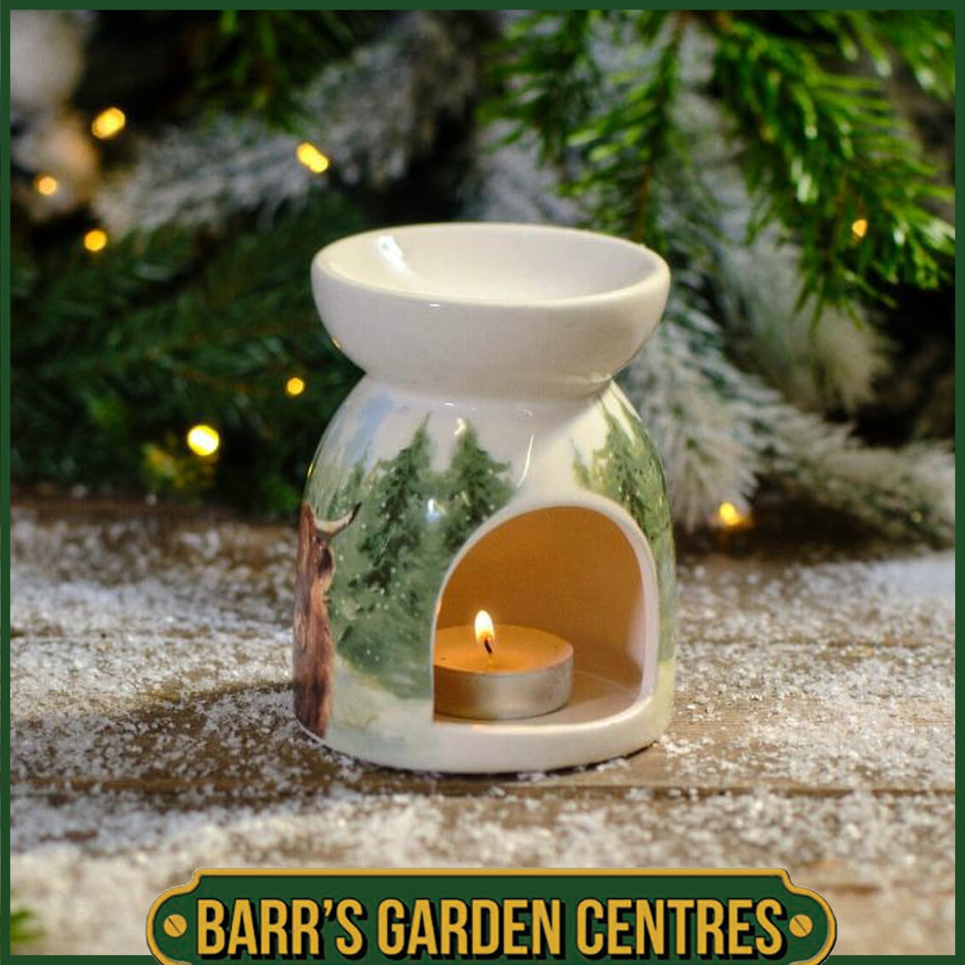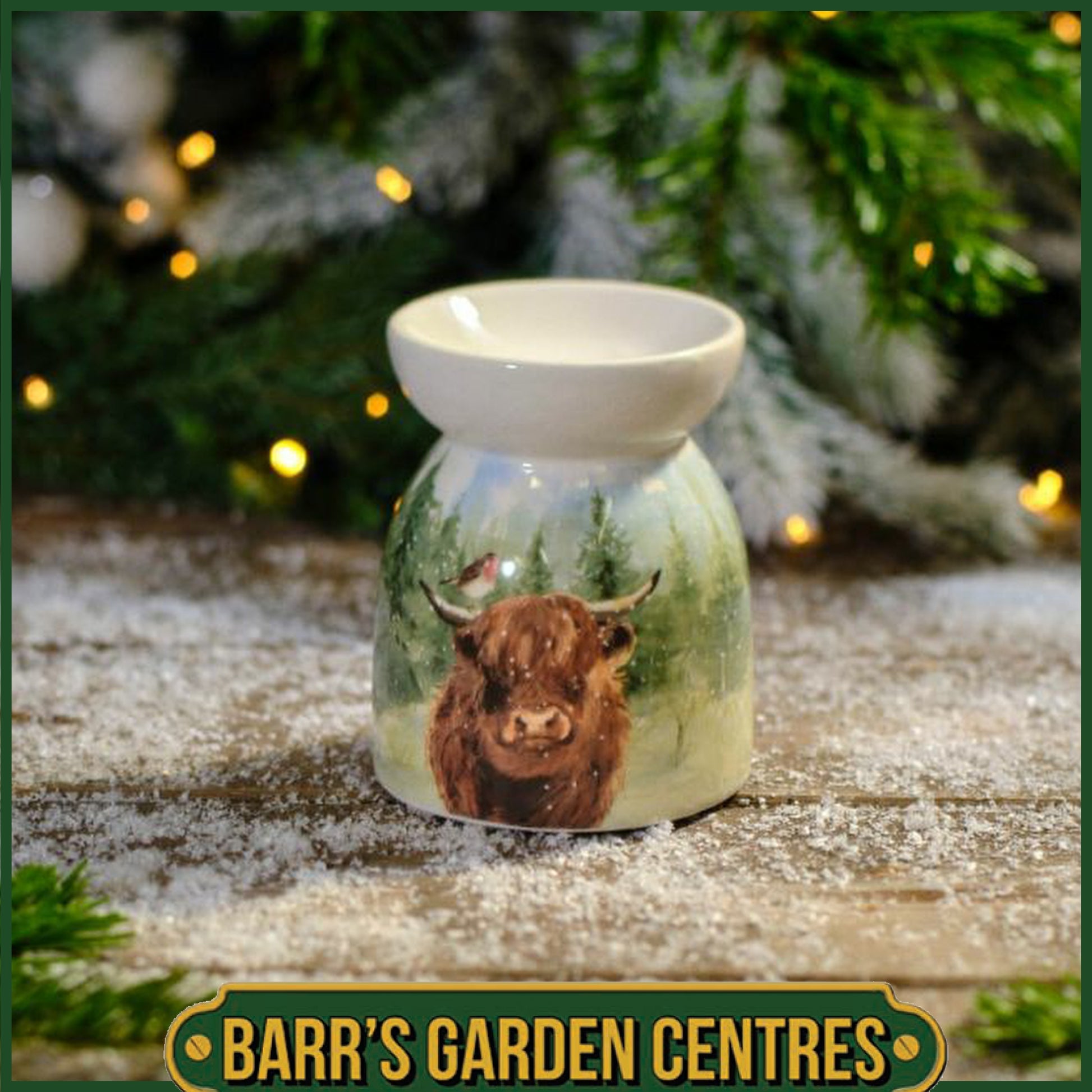 Add rustic elegance to your home with the Frosted Highland Cow Ceramic Burner. Featuring a frosted finish with a hand-painted design of Highland cows and green trees in cream, brown, and green tones, this burner combines countryside charm with festive style. The rounded top and wide bowl are perfect for holding wax melts or oils, creating a cosy and inviting atmosphere when in use.