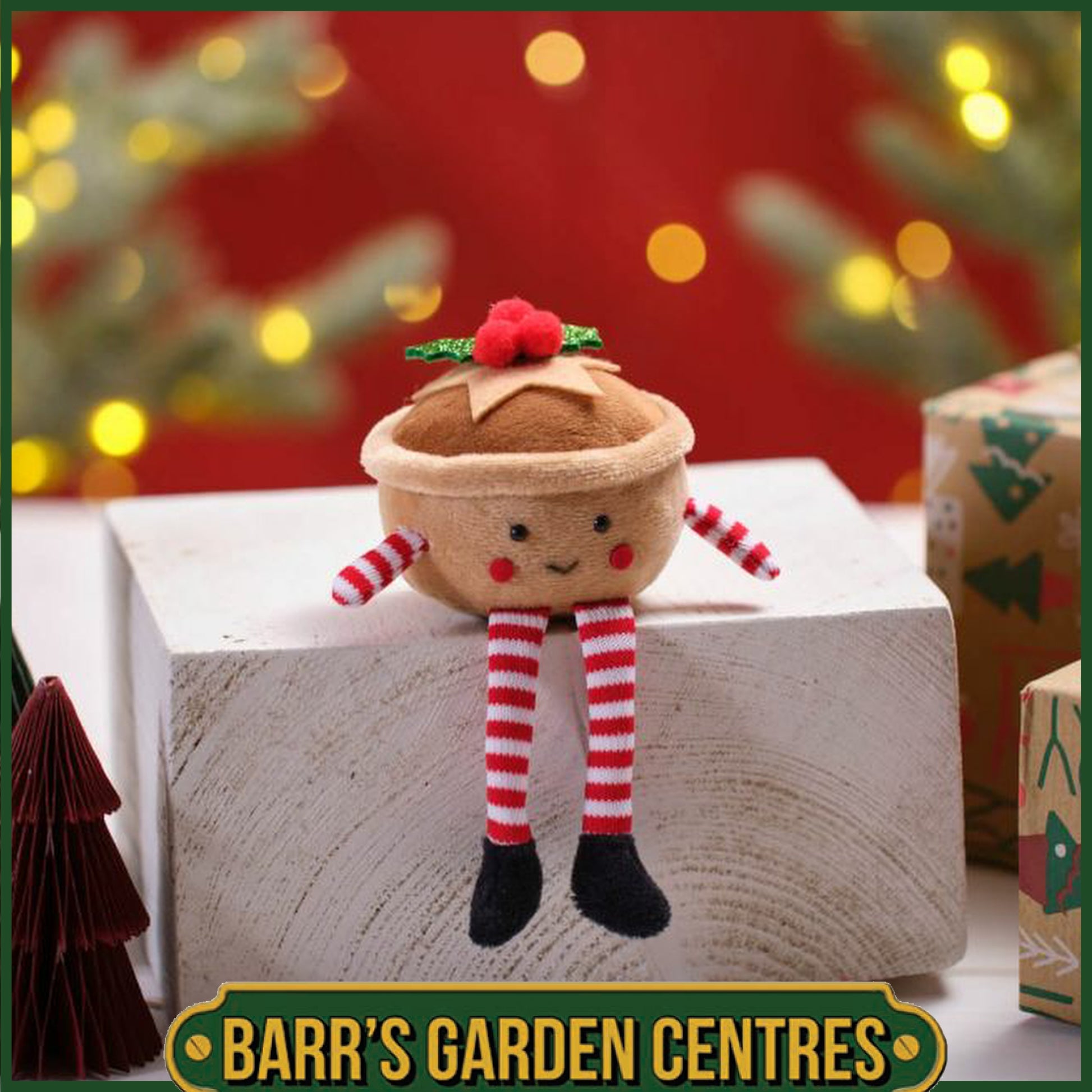 Add a playful festive touch with the Jingle & Joy Fabric Mince Pie Shelf Sitter. Featuring a soft brown and beige body with red, white, black, and green accents, this cheerful character is designed with striped arms and legs, black fabric feet, and an embroidered smiling face. Finished with a red berry decoration on top, it’s a whimsical and charming piece perfect for shelves, mantels, or holiday displays.
