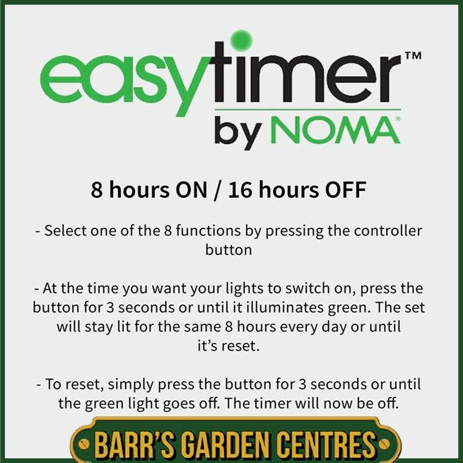 The NOMA lights have eight different settings for a unique and luminous spectacle. The handy timer function will allow these beautiful lights to illuminate for 8 hours at the same time every day, whilst an innovative memory function will recall the time at which you want your lights to switch on and your favourite setting - even after turning off at the mains socket!