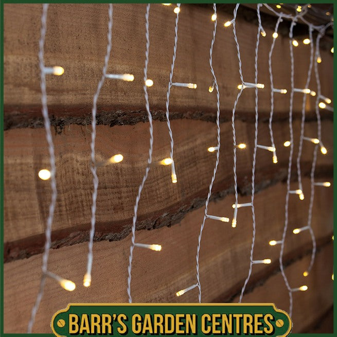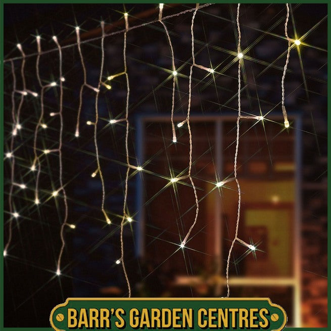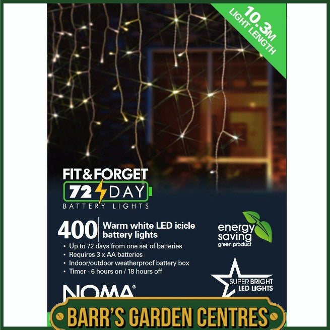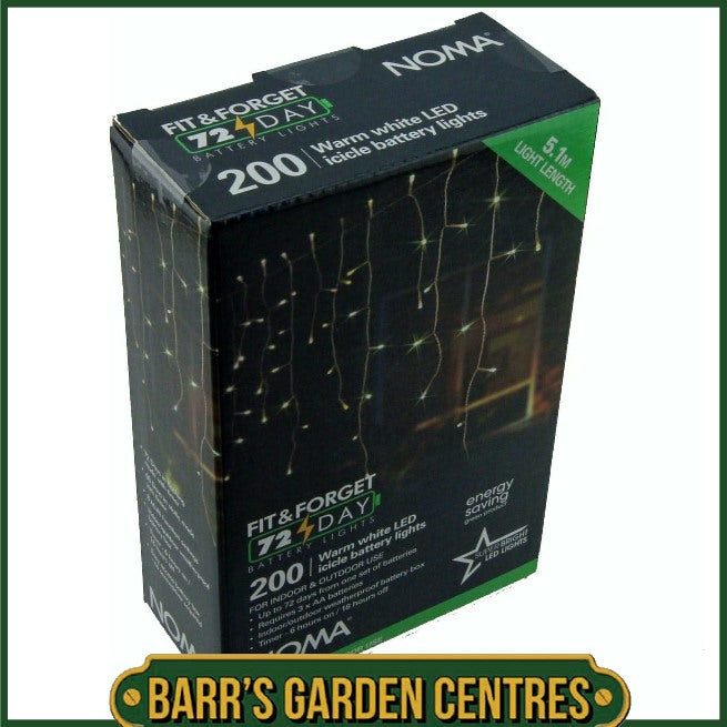 Add a simple yet highly effective touch to your outdoor lighting decor this Christmas, with the stunning Fit and Forget Lights from NOMA, in a delicate icicle design. Simply position as you prefer and let the battery-powered lights glow or flash through 8 different functions, with an impressive minimum lifetime of 60 days in static mode and 72 days in flashing mode from one set of batteries! These stunning sparkling lights hang vertically in varying lengths, with each brightly shining bulb emitting a gorgeous warm white tone that gives the illusion of falling snow wherever you choose to drape them. These NOMA lights are extremely popular for illuminating ceiling borders and outdoor trees. 0.5m out of the overall length is made up of the cable lead, which gives you the freedom you need to position the waterproof battery box securely and out of sight for the full icicle illusion!