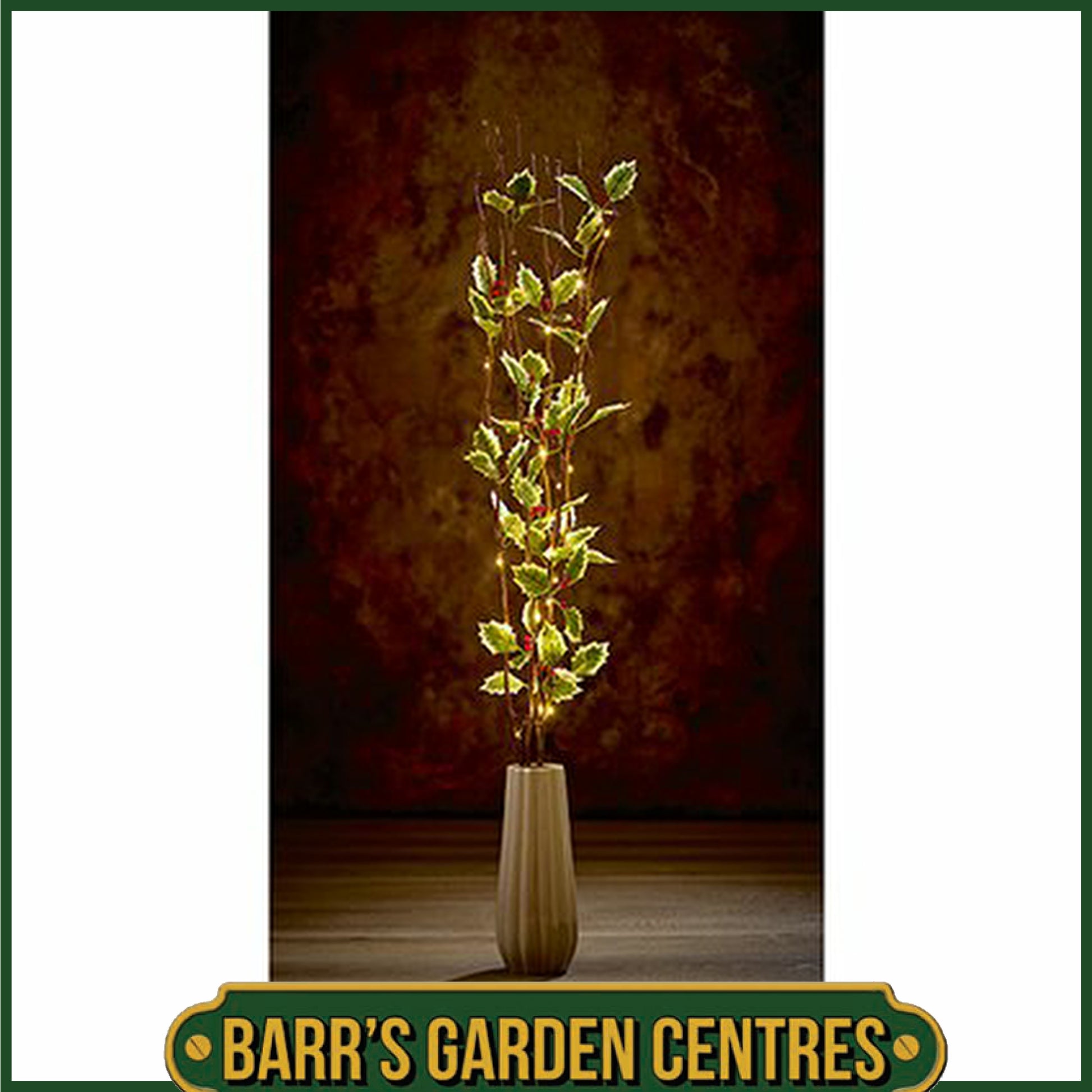 Add a touch of natural elegance to your festive decor with this 1.2 m set of 5 brown willow twigs. Adorned with holly leaves, red berries, and 40 warm white LEDs, these twigs bring a cosy, sparkling glow to your home. Battery-operated and low-maintenance, the clear, static lights highlight the natural beauty of the twigs while keeping your space safe and stylish. Perfect for tabletops, mantels, or as part of a larger holiday display.