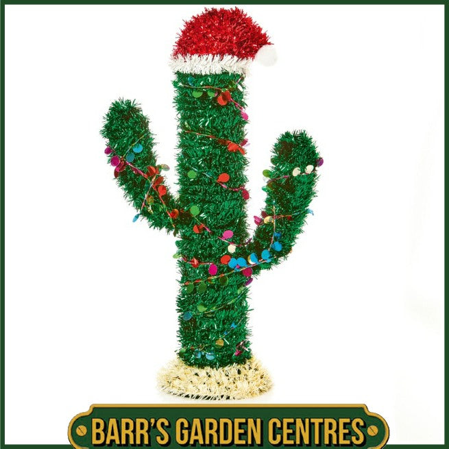 Bring a desert twist to your holiday decor with this quirky 35cm tinsel cactus, complete with a Santa hat and colourful lights!