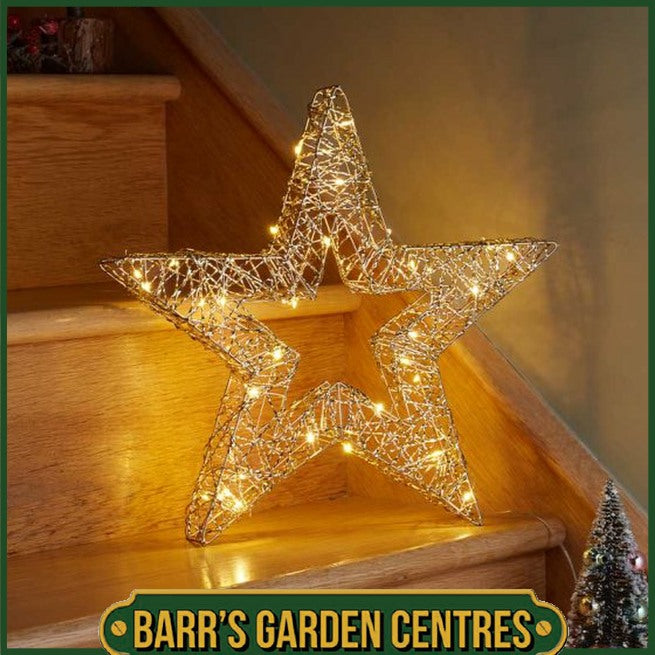 Bring a radiant touch of Christmas magic into your home with the Gold Weave WonderStar. This 38cm decorative star features a striking gold wire mesh design, filled with warm inlit LEDs that glow beautifully to create a cosy, festive ambiance. Perfect for placing on stairs, mantels, or tabletops, it lights up with a soft brilliance and includes a convenient auto timer for hassle-free operation. Powered by 3 x AA batteries (not included), it's easy to display anywhere indoors without the need for plugs or cables. Let this elegant star shine bright in your seasonal décor and fill your space with holiday warmth.