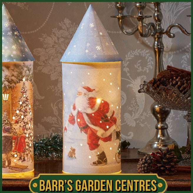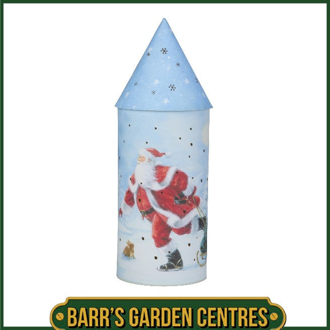 Bring classic Christmas cheer to your home with the charming InLit Decor House. Standing at 40cm tall, this festive tower-shaped lantern features a nostalgic illustration of Santa Claus journeying through a snowy landscape, spreading holiday joy. The conical roof and cylindrical body are delicately perforated with star and snowflake shapes that light up from within, casting a soft, magical glow across your room. Perfect for windowsills, mantels, or as a cosy centrepiece, this beautifully illuminated decoration captures the warmth and wonder of the season in a timeless, storybook style.