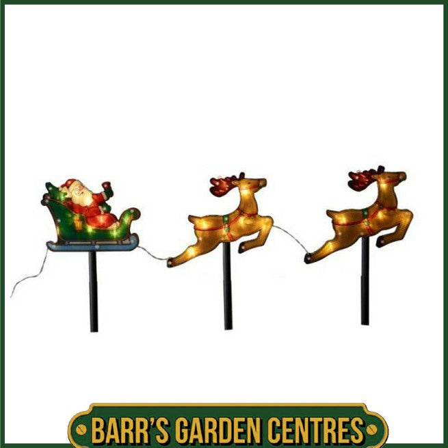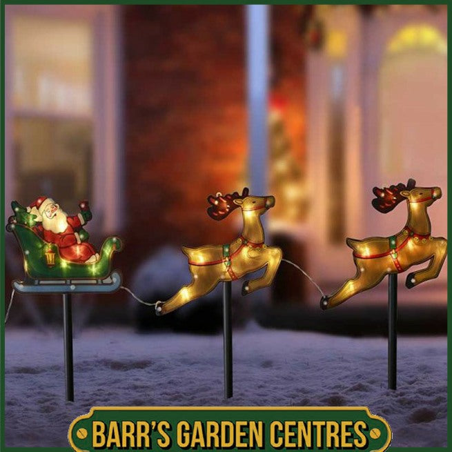 Add some festive flair to your garden or home with the Three Kings Battery Santa's Sleigh Stakes LED Light Figure. Glowing with 23 warm white LEDs, this charming decoration brings Santa, his sleigh and reindeer team to life. It’s perfect for indoor or outdoor use, and the handy built-in timer means it lights up for 8 hours, then switches off for 16, so there's no need to get up and turn it off. Just pop in the batteries and let the Christmas magic shine!