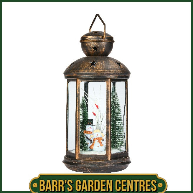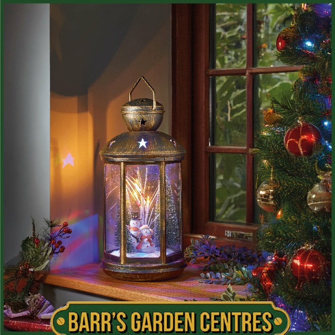 Add a magical touch to your festive décor with the SnowFall Snowman Lantern. This beautifully crafted antique-style lantern showcases a cosy winter scene with two cheerful snowmen, snow-dusted trees, and glowing birch branches. When lit, it projects soft star-shaped lights onto nearby walls and ceilings, casting a warm, colourful ambiance throughout your space. The rustic bronze finish and charming cut-out stars make it a timeless piece for window ledges, mantels, or side tables. Perfect for creating a cosy Christmas atmosphere, this lantern blends nostalgic charm with enchanting light effects to bring your home to life for the holidays.