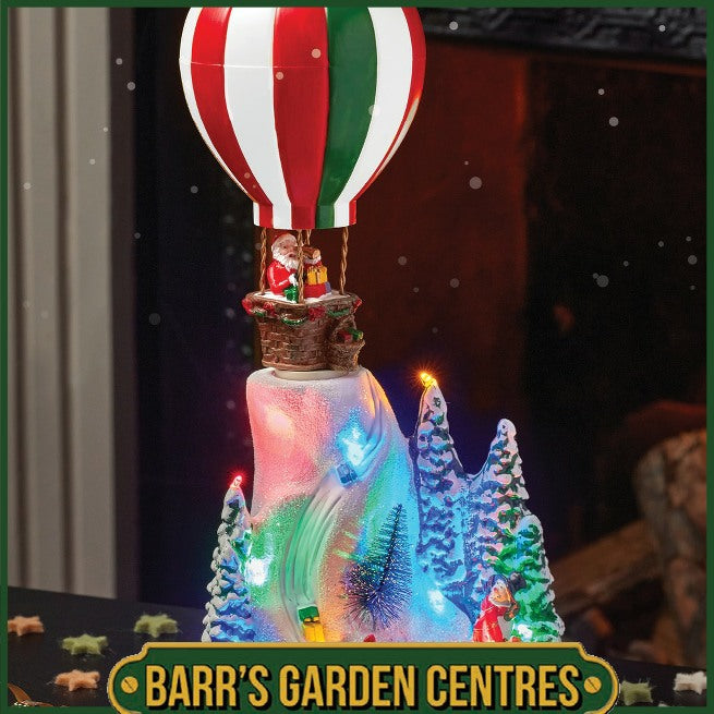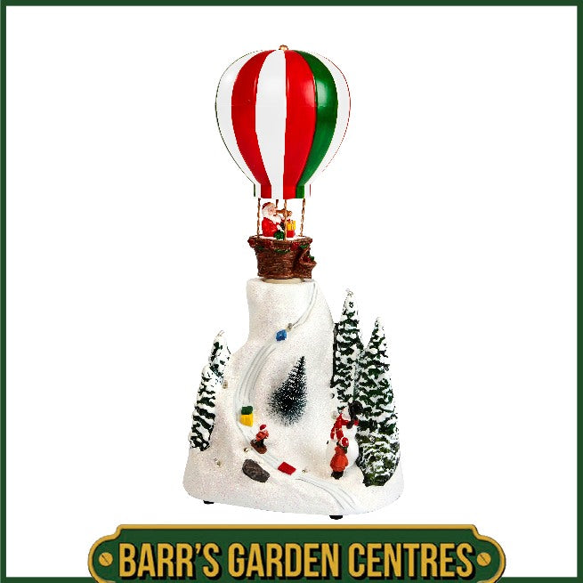 Featuring Santa riding his sleigh pulled by two reindeer, this charming decoration is set on a snowy base dotted with twinkling trees. Multicoloured LED lights add a warm, festive glow that creates a cosy holiday atmosphere.