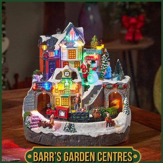This beautifully detailed snow-covered village features Santa, a snowman, gift shop, train station, and joyful figures bustling in a winter wonderland. Multicoloured LEDs light up the scene to create a warm and festive atmosphere, perfect for brightening any room.